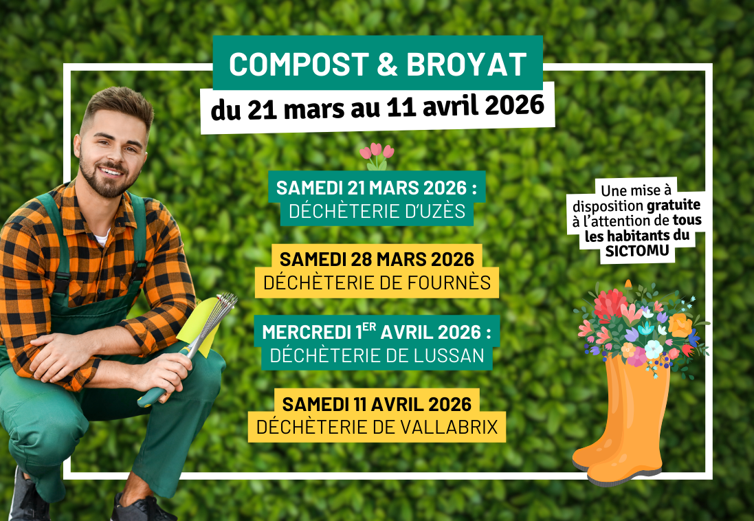 En partenariat avec le syndicat de traitement des déchets Sud Rhône Environnement, le SICTOMU organise au printemps quatre journées dédiées à la distribution gratuite de compost et de broyat de déchets verts.